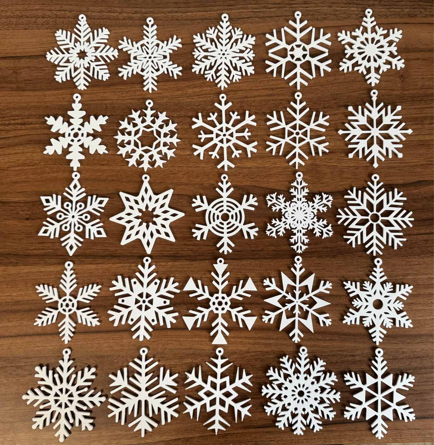 Pospremite vaše božično drevo v pravo zimsko pravljico s tem setom 25 unikatnih 3D natisnjeni snežink! Vsaka snežinka je edinstvena po dizajnu – od klasičnih šesterokotnih vzorcev do modernih, geometrijskih in filigranskih oblik, ki se nežno svetijo v lučkah drevesa.