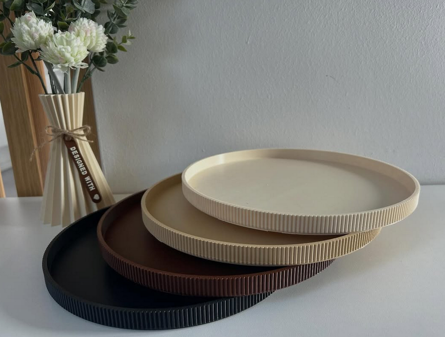 Odkrijte praktično eleganco z našim 3D natisnjenim okroglim pladnjem premera 250 mm. Nežen rebrast rob zagotavlja boljši oprijem in subtilen teksturni učinek, ravno dno pa je idealno za serviranje prigrizkov, organizacijo kozmetike, nakita, sveč ali kot dekorativni podstavek za rastline in vaze.