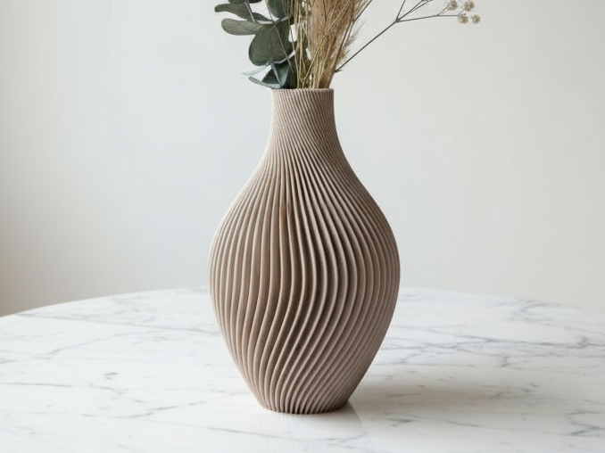 Odkrijte prefinjeno lepoto z našo 3D natisnjeno vazo v nežni bež barvi, ki jo odlikuje spiralno zavita rebrasta površina. Gladke krivine in vertikalne rebri ustvarijo hipnotičen twist učinek, ki se nežno vija od ozke baze do širšega vratu, kar daje vazi skulpturalen in sodoben videz.