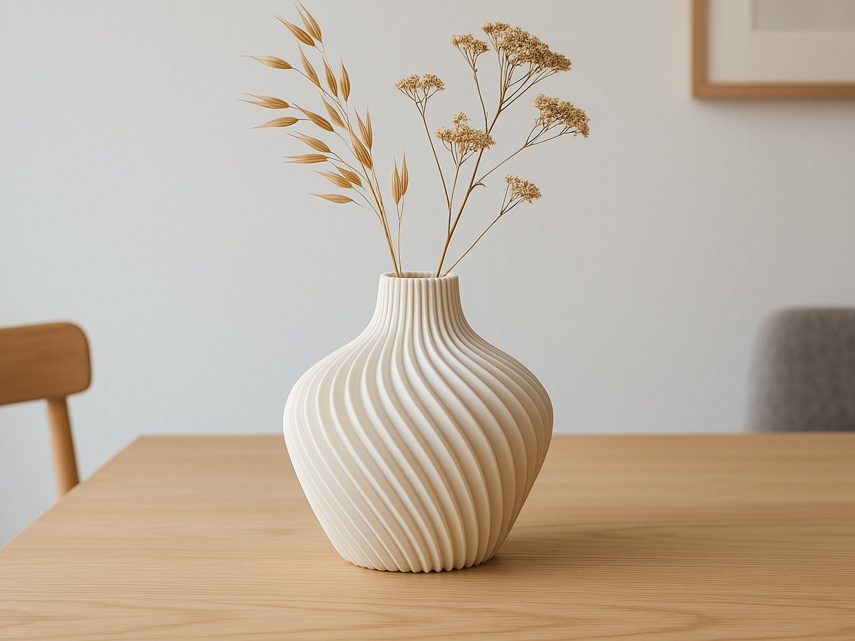 Odkrijte čudovito eleganco z našo 3D natisnjeno vazo v spiralni rebrasti obliki. Nežne, zavite rebri ustvarijo dinamičen twist učinek, ki spominja na valove ali mehko draperijo, ter zagotavljajo očarljiv odboj svetlobe iz vseh kotov.