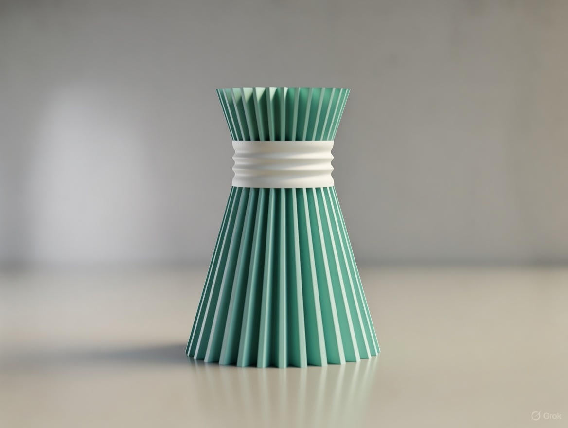 Predstavljamo vam eleganten set 3D natisnjenih vaz v nagubani (pleated) obliki, ki spominja na draperijo ali zavezano tkanino. Vsaka vaza ima značilen "pas" v sredini, ki poudari peščeno uro obliko, z nežnimi vertikalnimi rebri za očarljiv teksturni učinek.
